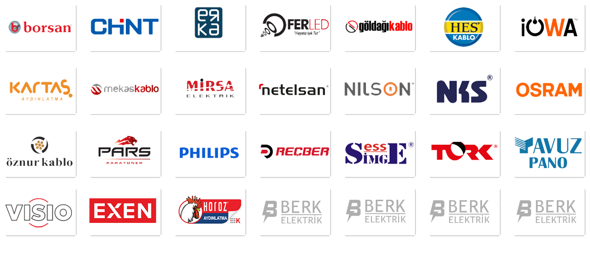 Birinci sınıf TSE, CE, İSO- 9000 ve 9001 belgeli kaliteli elektrik malzemelerinin satışını yapmaktayız. Berk Elektrik mağazalarında Türkiye'nin en iyi markalarının ürünleri toptan ve perakende fiyatına satılmaktadır. Projeleriniz için elektrik malzemeleri temini yapmadan önce firmamızdan mutlaka fiyat teklifi alınız.
